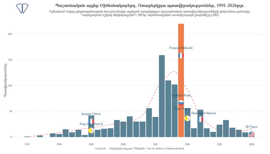 Վիճակագրական տվյալների ուսումնասիրությունից պարզ է դառնում, որ հուշահամալիրն ընդունել է 102 պաշտոնական պատվիրակություն 2014 թվականին, 220՝ 2015 թվականին և 56՝ 2016 թվականին։ Արդեն 2023 թվականին ցուցանիշը կրճատվել է մինչև 18, իսկ 2025 թվականին՝ 9։ 2026 թվականի ապրիլի դրությամբ արձանագրվել է 8 այց, որոնց թվում՝ ԱՄՆ փոխնախագահ Ջեյ Դի Վենսի այցը։ Թեև հուշահամալիր այցելությունը համարժեք չէ իրավական ճանաչմանը, դիվանագիտական հաղորդակցության համատեքստում այն ունի ծանրակշիռ նշանակություն. այն գործնական քայլ է, որով արտացոլվում է տվյալ կառավարության քաղաքական ընտրությունը։