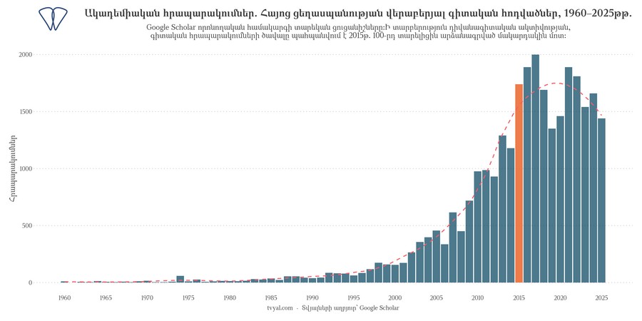 Վերոնշյալ գծապատկերում ներկայացված են Google Scholar համակարգում «Հայոց ցեղասպանություն» թեմայով հրապարակումների տարեկան ցուցանիշները 1960-ից 2025 թվականներին։ Մինչև 1990 թվականն արձանագրվել են ցածր ցուցանիշներ (տասնյակներ 1970-ականներին և հարյուրից պակաս՝ 1980-ականներին)։ Աճի տեմպերը կտրուկ արագացել են 2000-ականներից հետո՝ 2010 թվականին հասնելով տարեկան 976 հրապարակման։ 100-րդ տարելիցի արդյունքում ցուցանիշը հասել է 1740-ի, իսկ առավելագույն մակարդակը գրանցվել է 2017 թվականին՝ կազմելով 2000 հրապարակում։