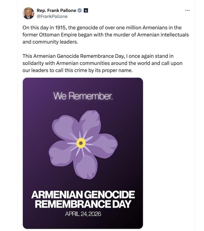 ԱՄՆ կոնգրեսական Ֆրենկ Փալոնը հաղորդագրություն է տարածել Հայոց ցեղասպանության 111-րդ տարելիցի կապակցությամբ՝ համերաշխություն հայտնելով աշխարհասփյուռ հայ համայնքներին։