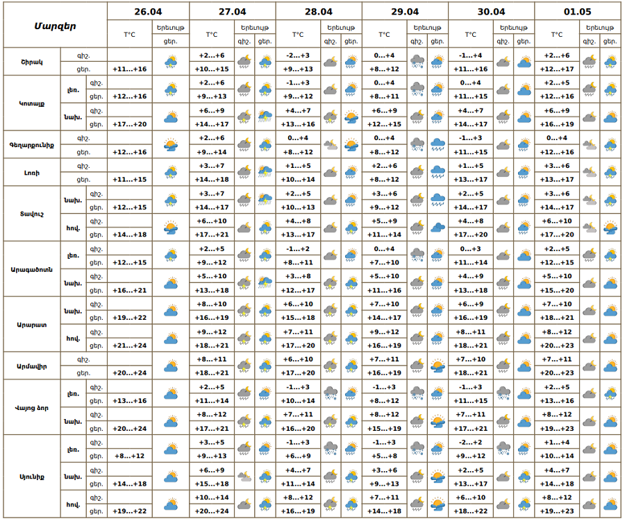 Ապրիլի 26-ի կեսօրից հետո, 27-30-ին և մայիսի 1-ին ժամանակ առ ժամանակ առանձին շրջաններում սպասվում է կարճատև անձրև և ամպրոպ, տեղ-տեղ հնարավոր է կարկուտ: Ապրիլի 27-ի ցերեկն առանձին հատվածներում տեղումները կլինեն ինտենսիվ։ Քամին`հարավարևմտյան`2-5 մ/վ, ամպրոպի ժամանակ սպասվում է նաև քամու ուժգնացում 16-20 մ/վ արագությամբ։ Օդի ջերմաստիճանն ապրիլի 27-29-ին աստիճանաբար կնվազի՝ 4-6 աստիճանով, ապրիլի 30-ին և մայիսի 1-ին աստիճանաբար նույնքան կբարձրանա։