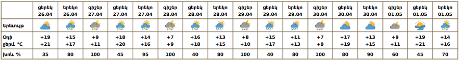 Ապրիլի 26-ի երեկոյան, ապրիլի 27-29-ին ժամանակ առ ժամանակ, 30-ի գիշերը, մայիսի 1-ի երեկոյան ժամերին սպասվում է կարճատև անձրև և ամպրոպ, ամպրոպի ժամանակ սպասվում է նաև քամու ուժգնացում՝ 16-19մ/վ արագությամբ։ Ապրիլի 30-ի ցերեկը, մայիսի 1-ի գիշերը սպասվում է առանց տեղումների եղանակ։