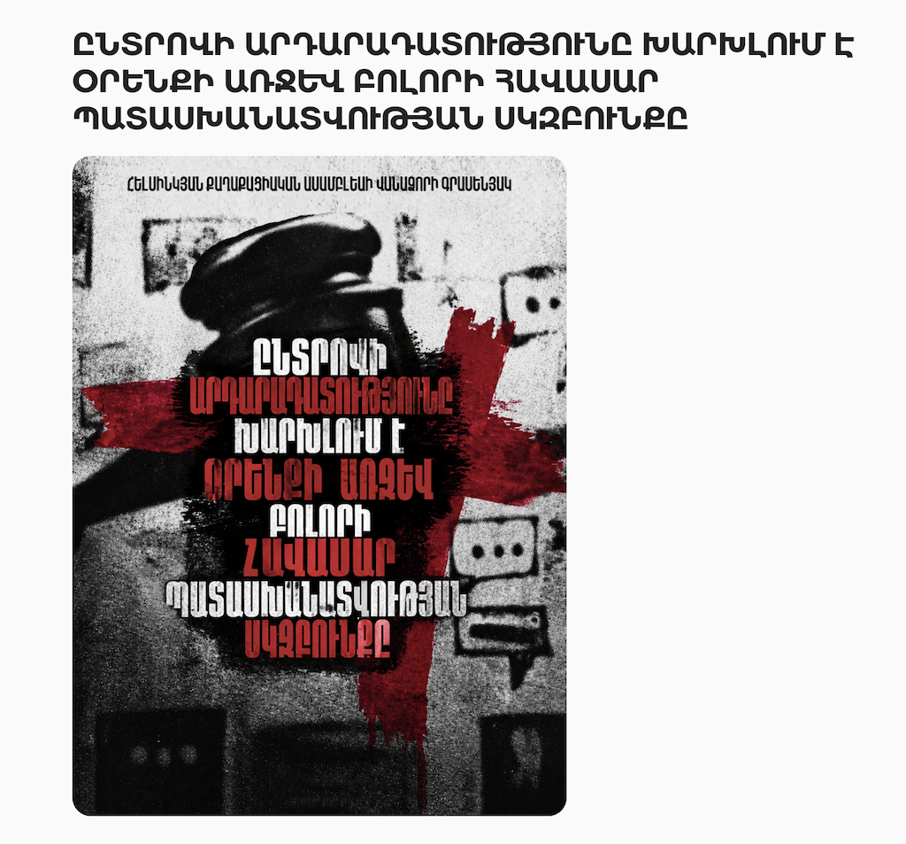 Վերոնշյալ հայտարարությունների վերաբերյալ Կազմակերպությունն արձանագրել է, որ դրանք կարող են պարունակել ՀՀ քրեական օրենսգրքի 419-րդ հոդվածով նախատեսված՝ իշխանությունը յուրացնելու, 418-րդ հոդվածով նախատեսված՝ պետական դավաճանության, ինչպես նաև 424-րդ հոդվածով նախատեսված՝ լրտեսության հանցակազմերի հատկանիշներ։