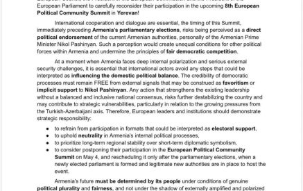 Փաշինյանի վարչակազմը իրավապահ և դատական համակարգերն օգտագործում է քաղաքական հակառակորդների և հոգևորականների դեմ. հայկական 6 կուսակցություններ դիմել են ԵՄ ղեկավարությանը