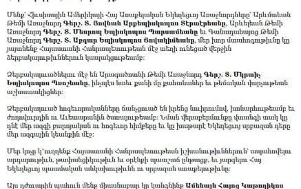 Հյուսիսային Ամերիկայի հայ առաքելական եկեղեցու թեմակալ առաջնորդները մտահոգություն են հայտնել Արագածոտնի թեմի առաջնորդ Մկրտիչ եպիսկոպոս Պռոշյանի, քահանաների և առաջնորդարանի աշխատակիցների ձերբակալությունների կապակցությամբ
