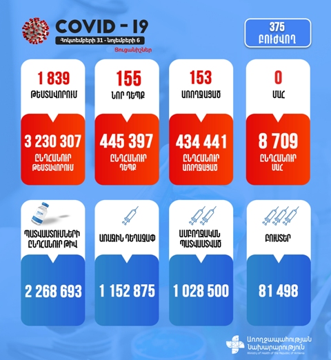 Շաբաթվա ընթացքում կորոնավիրուսային հիվանդության 155 նոր դեպք է հաստատվել