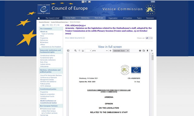 Վենետիկի հանձնաժողովը կարծիք է հրապարակել Օմբուդսմենի աշխատակազմի օրենսդրական փոփոխությունների վերաբերյալ